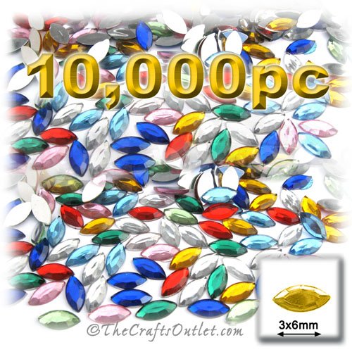 10,000pc Rhinestones crystals Eye Shaped (Navette) Shape made of Quality Acrylic sparkling with multi Facetted sides and flat top Solid Colors Assortment - 5 Colors (Clear, Yellow, Royal Blue, Emerald Green, Ruby Red) Gems Flatback with Silver Aluminum foil mirror backing size - 3x6mmBuy these rhinestones and embellish a variety of crafts projects. You can add these Acrylic facetted rhinestones to many projectsAdd gemstones to Baby Keepsake items Blitz your nails with rhinestones Highlight your