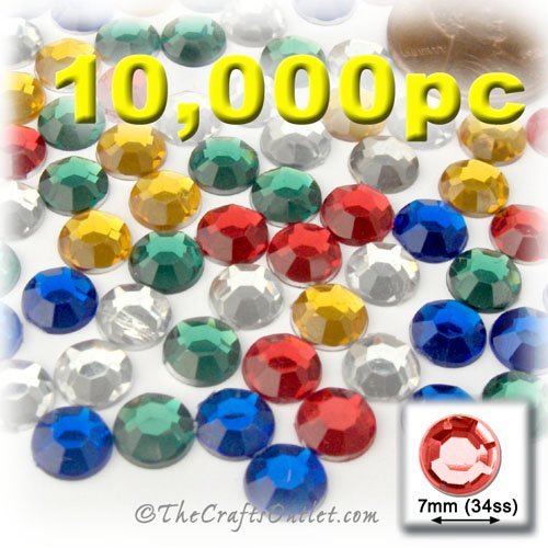 10,000pc Rhinestones crystals Round Shape made of Quality Acrylic sparkling with multi Facetted sides and flat top Solid Colors Assortment - 5 Colors (Clear, Yellow, Royal Blue, Emerald Green, Ruby Red) Gems Flatback with Silver Aluminum foil mirror backing size - 7mm about Buy these rhinestones and embellish a variety of crafts projects. You can add these Acrylic facetted rhinestones to many projectsAdd gemstones to Baby Keepsake items Blitz your nails with rhinestones Highlight your scrapbook