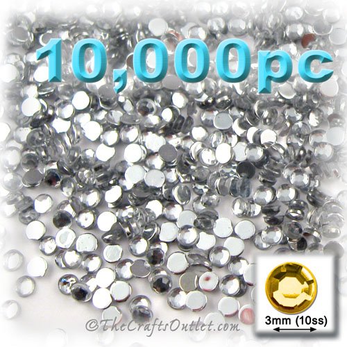 10,000pc Rhinestones Round Shape made of Quality Acrylic sparkling with multi Facetted sides and flat top Crystal Clear Flatback with Silver Aluminum foil mirror backing size - 3mm about Buy these rhinestones and embellish a variety of crafts projects. You can add these Acrylic facetted rhinestones to many projectsAdd gemstones to Baby Keepsake items Blitz your nails with rhinestones Highlight your scrapbook memory pages with these colourful jewels Dazzle your picture frames and make unique memo