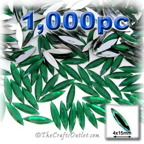1,000pc Rhinestones crystals Eye Shaped (Navette) Shape made of Quality Acrylic sparkling with multi Facetted sides and flat top Emerald Green Gems Flatback with Silver Aluminum foil mirror backing size - 4x15mmBuy these rhinestones and embellish a variety of crafts projects. You can add these Acrylic facetted rhinestones to many projectsAdd gemstones to Baby Keepsake items Blitz your nails with rhinestones Highlight your scrapbook memory pages with these colourful jewels Dazzle your picture fra
