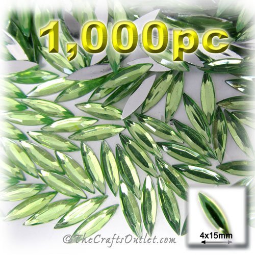 1,000pc Rhinestones crystals Eye Shaped (Navette) Shape made of Quality Acrylic sparkling with multi Facetted sides and flat top Peridot Light Green Gems Flatback with Silver Aluminum foil mirror backing size - 4x15mmBuy these rhinestones and embellish a variety of crafts projects. You can add these Acrylic facetted rhinestones to many projectsAdd gemstones to Baby Keepsake items Blitz your nails with rhinestones Highlight your scrapbook memory pages with these colourful jewels Dazzle your pictu
