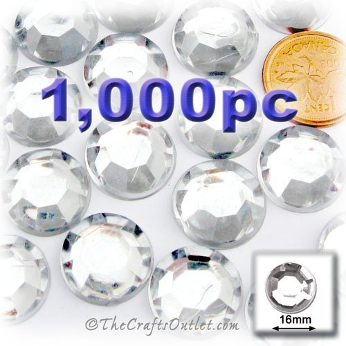 1,000pc Rhinestones Round Shape made of Quality Acrylic sparkling with multi Facetted sides and flat top Crystal Clear Flatback with Silver Aluminum foil mirror backing size - 16mm about Buy these rhinestones and embellish a variety of crafts projects. You can add these Acrylic facetted rhinestones to many projectsAdd gemstones to Baby Keepsake items Blitz your nails with rhinestones Highlight your scrapbook memory pages with these colourful jewels Dazzle your picture frames and make unique memo
