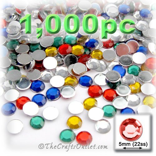 1,000pc Rhinestones crystals Round Shape made of Quality Acrylic sparkling with multi Facetted sides and flat top Solid Colors Assortment - 5 Colors (Clear, Yellow, Royal Blue, Emerald Green, Ruby Red) Gems Flatback with Silver Aluminum foil mirror backing size - 5mm about Buy these rhinestones and embellish a variety of crafts projects. You can add these Acrylic facetted rhinestones to many projectsAdd gemstones to Baby Keepsake items Blitz your nails with rhinestones Highlight your scrapbook m