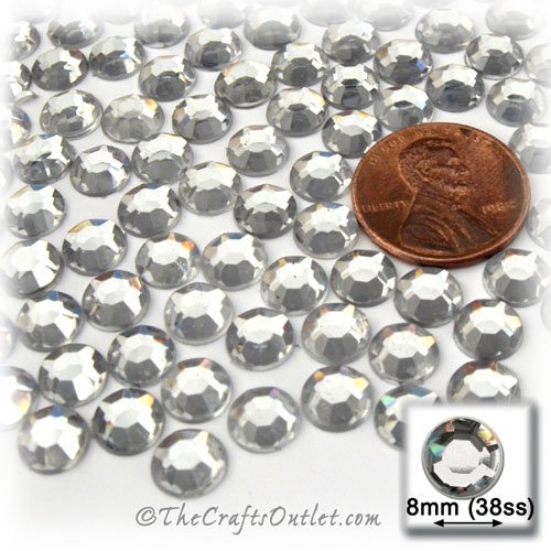 144pc Rhinestones Round Shape made of Quality Acrylic sparkling with multi Facetted sides and flat top Crystal Clear Flatback with Silver Aluminum foil mirror backing size - 8mm about Buy these rhinestones and embellish a variety of crafts projects. You can add these Acrylic facetted rhinestones to many projectsAdd gemstones to Baby Keepsake items Blitz your nails with rhinestones Highlight your scrapbook memory pages with these colourful jewels Dazzle your picture frames and make unique memorie
